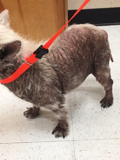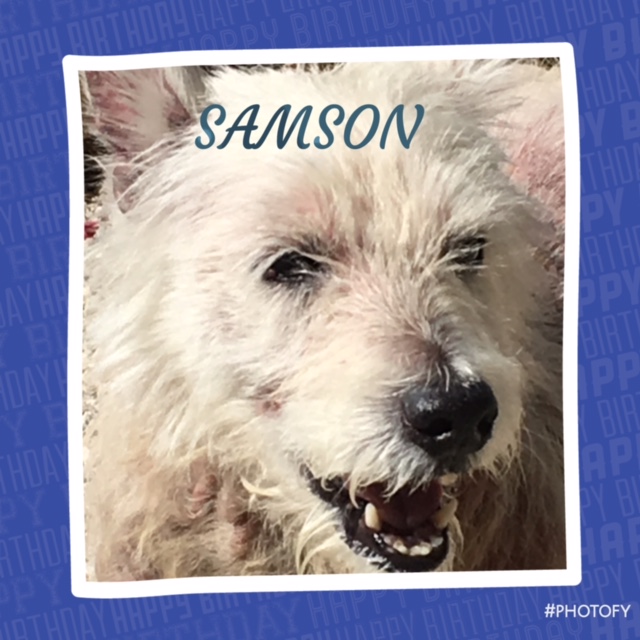 March 2017 a call was placed to our local shelter, the caller stated a dog was tied to a tree  and in poor physical condition. Caller stated there  was not a home , a bowl of water or an owner present. This poor dog was in such poor shape. His skin was leathered , with lots of open sores. Samson was taken to the shelter and his owner was located. After some background searching they realized Samson had been at the shelter before, owner was on record. He never came for Samson which is probably  the best thing for Samson . Today he is in the care of Senior Paws Sanctuary and being treated for a severe skin infection. Many test have been ran, skin scrapings done and there is not  any indication as to what may be causing the infection at this time. There is three layers of skin infected and top layer was severely sun burned at the time he was picked up. The rescue has brought Samson up to date on his vaccinations and working on  the skin issue. Possibility of a flea reaction, allergies left untreated for years, the pain , itching and discomfort was obvious he had lived in this condition a long time.