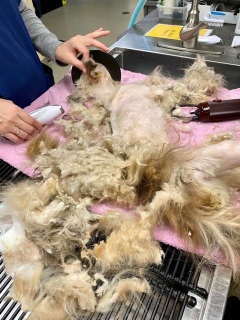 Sometimes words can not explain your heartache. Today we welcomed an 18 year old horribly neglected little six pound boy. He was adopted less than two years ago from our local shelter to be found as a stray and in the worse condition recently . Tongue hanging out from loss of teeth, mats so close to his skin walking was impossible without tugging and pulling on his skin causing pain. He is 18 years old and wags his tail when you talk to him , where is our human compassion gone to ? He has not given up, and we will not give up on him ! Meet Tra which means STRONG AND MIGHTY!